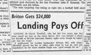 Working through the headlines: “First footprints on alien world” – “Everything ‘Go’ Astronauts walk in lunar dust” – “Moon is magnificent desolation” – “Old Glory hoisted by first moon men” my eye was caught by the headline: “Briton gets $24,000. Landing Pays off.” It was a short article at the foot of the Tulsa Daily Herald from 21st July 1969 and tells the story of David Thelfall who, in 1964, placed a bet of £10, that a man would set foot on the moon before 1971. At the time £10 was twice the weekly wage.