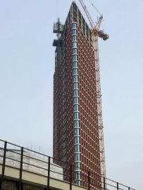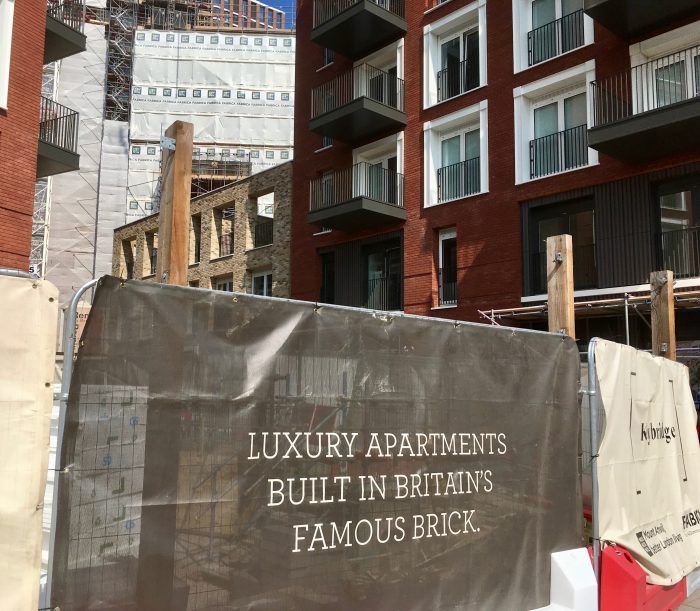 Close to us, is a high-rise block that mimics the Flat Iron Building in New York along with a series of apartments in low rise townhouses. They are advertised as Luxury Apartments Built in Britain’s Famous Brick. Except they aren’t. They are built of steel and glass and clad in brick. It is real brick, I’ve had a close look, but it’s half an inch thin and stuck to a metal frame that’s attached to the side of the building. Built in brick? Fake news.
